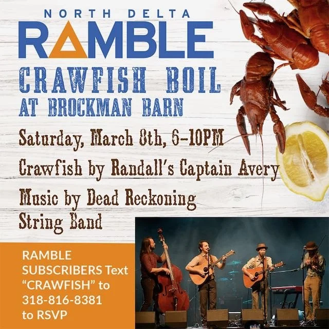 Back to All Events Crawfish Boil @ Brockman Barn Saturday, March 8, 2025 6:00 PM 10:00 PM Google Calendar ICS Brockman Barn annual crawfish boil. Select crawfish provided by Randall’s Captain Avery and boiled on site. Crawfish sold in 5lb increments. Music by Dead Reckoning String Band. Text 318-816-8381 to RSVP tickets.